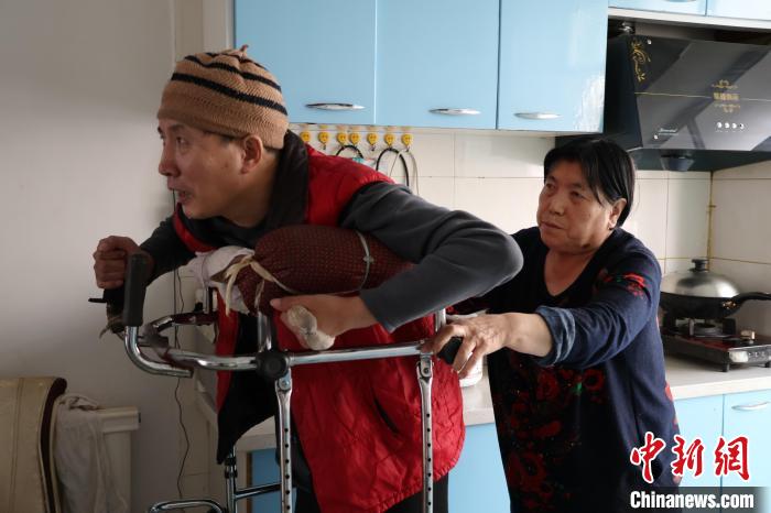 图为聂淑兰帮儿子做康复训练。张静摄