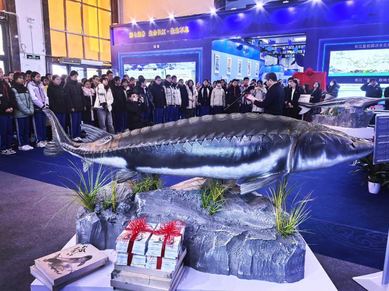 《生命长江》科普丛书发布会现场,150余名来自北京市的中小学生还兴致勃勃地参观了《生命长江 生生不息——长江禁渔五年展》,现场聆听关于长江水生生物保护的专题讲座。清华附中管庄学校、平谷第三中学的学生代表在发布会上发出倡议,表示要争做长江保护的“小小宣传员”。
