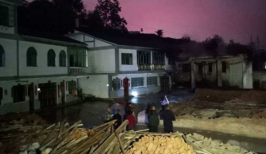 顺着斜坡一路往上走,记者来到了起火的建筑附近,只见石板镇政府的工作人员,派出所的民警还有村委会的工作人员全部守在现场。