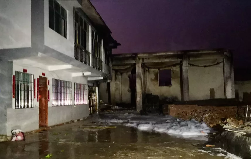 记者看到,起火的地方是未封闭的房屋,一旁的民房也被殃及,墙面被熏黑,地上全是泡沫,流出的消防水还冒着热气。