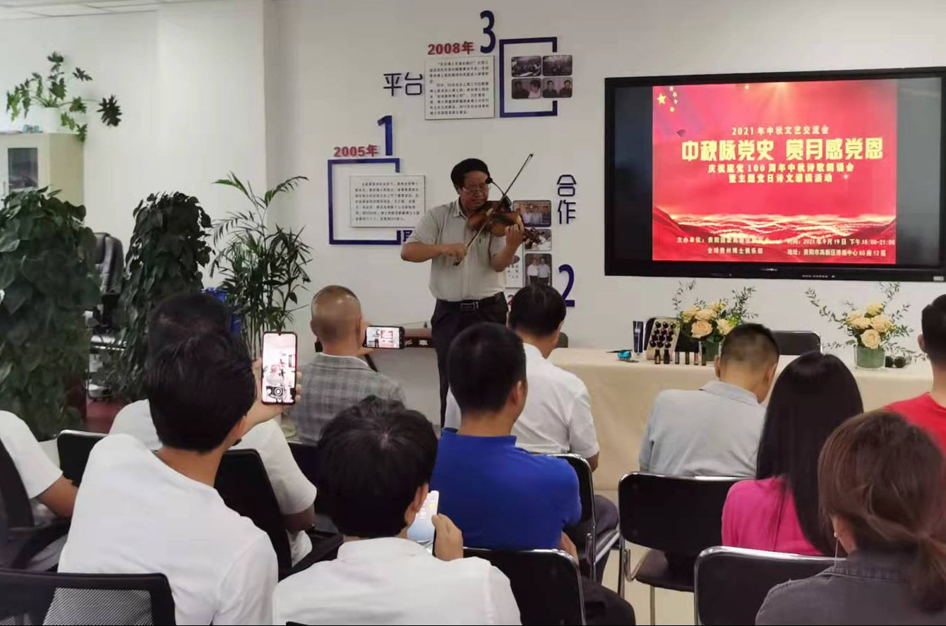 诗歌朗诵、谜语竞猜……,丰富多彩的活动在全球(贵州)博士俱乐部主席李从国一首优美的《彩云追月》小提琴演奏声中拉开了帷幕。据了解,此次活动以“中秋咏党史 赏月感党恩”为主题,由贵阳国家高新区新联会联合全球贵州博士俱乐部共同举办,旨在通过党史分享、诵读中华经典、文艺表演等活动,引导人们感受“中秋节”这一传统文化的魅力,增强对传统文化的认同感。