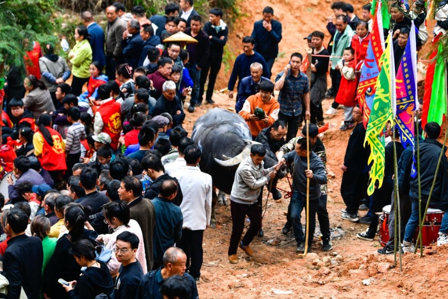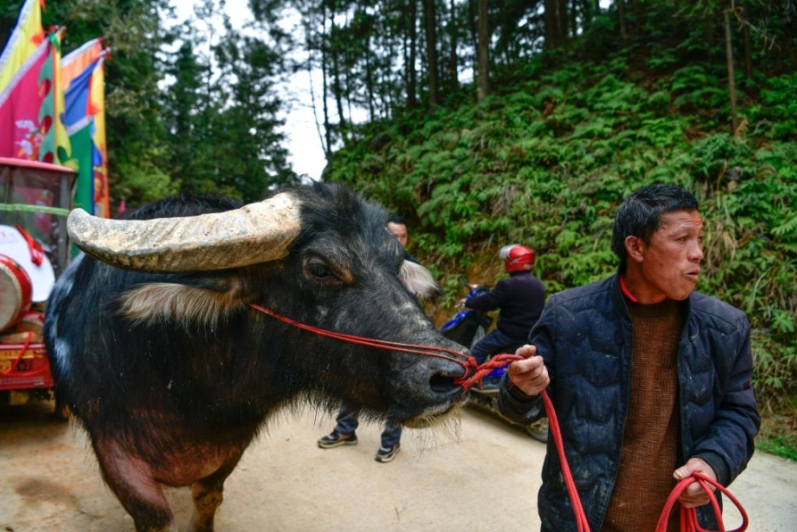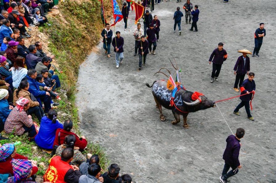4月6日,人们在贵州省锦屏县固本乡东庄村观看斗牛游塘仪式。新华社记者 杨文斌 摄