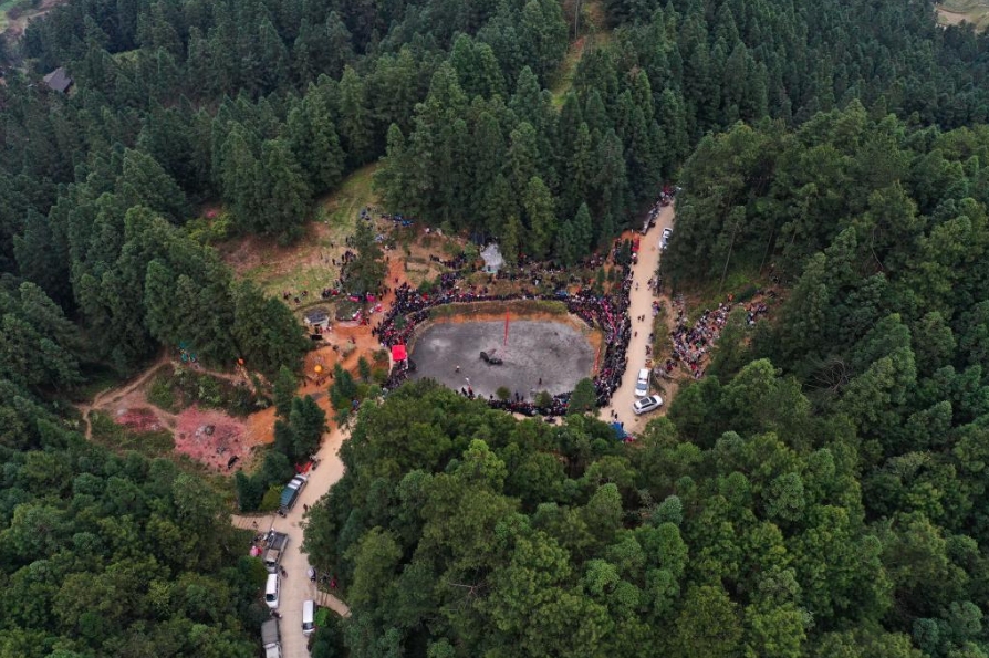 这是4月6日拍摄的贵州省锦屏县固本乡2025年新民片区三月初九牯藏节斗牛民俗活动现场(无人机照片)。新华社记者 杨文斌 摄