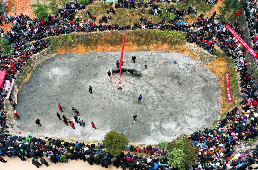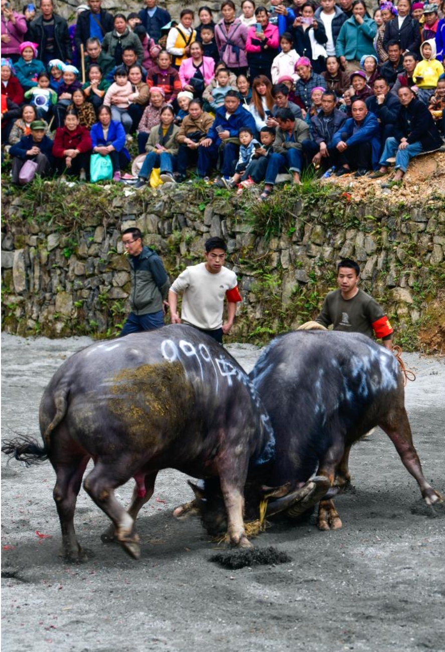当日,贵州省黔东南苗族侗族自治州锦屏县固本乡举办2025年新民片区三月初九牯藏节斗牛民俗活动,来自各苗乡侗寨的人们齐聚斗牛塘,斗牛欢庆牯藏节。