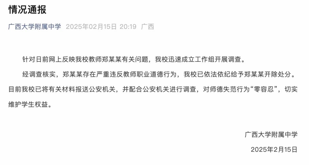 经调查核实,郑某某存在严重违反教师职业道德行为,学校已依法依纪给予郑某某开除处分。目前学校已将有关材料报送公安机关,并配合公安机关进行调查,对师德失范行为“零容忍”,切实维护学生权益。