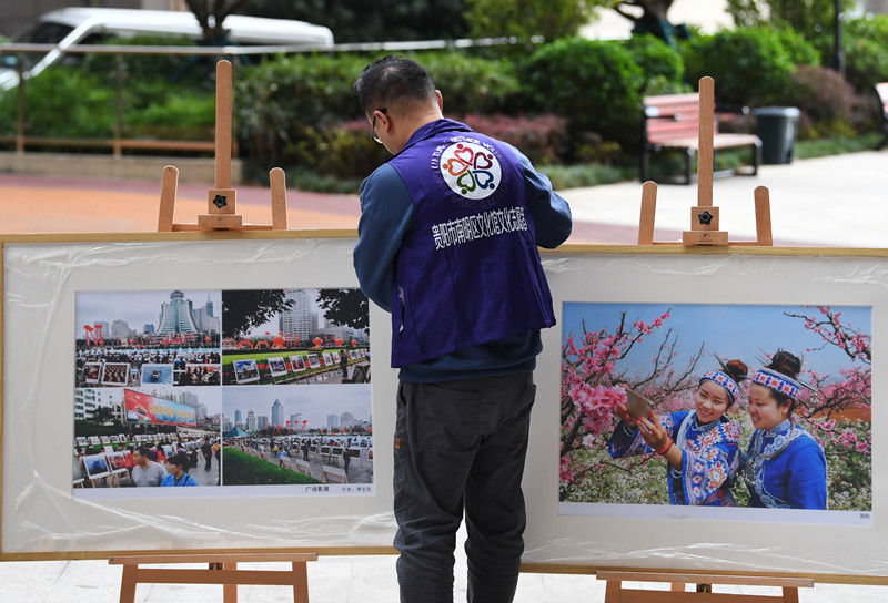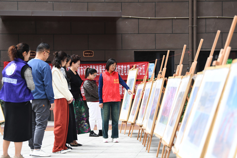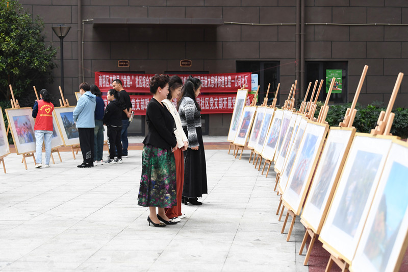 贵阳市南明区太慈桥街道电建一公司社区的居民正在观赏“党建+”社区综合文化站集文化·城市记忆摄影巡展。