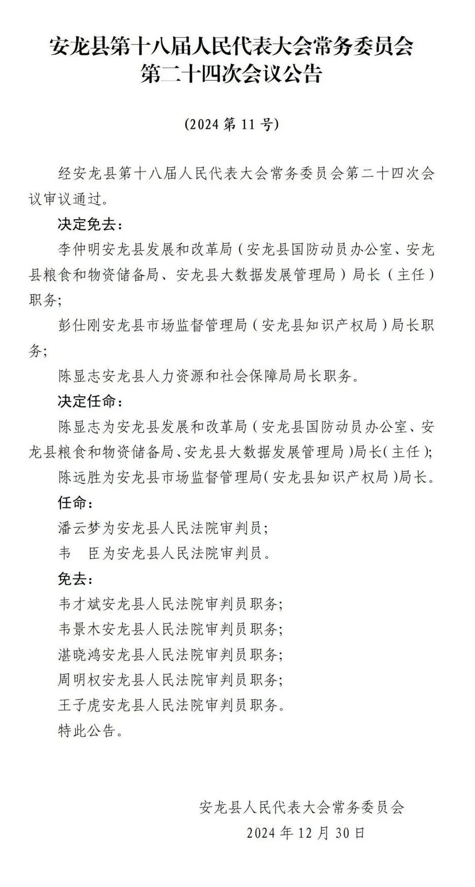 2024年12月30日,安龙县第十八届人大常委会第二十四次会议举行。会议表决通过有关人事任免职议案。新任命人员进行了宪法宣誓。