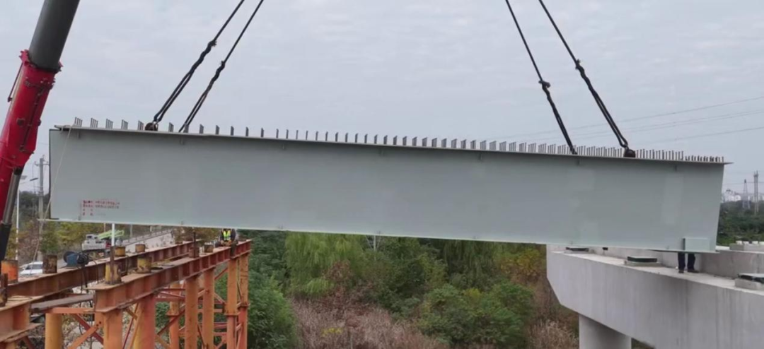 在梁郭路特大桥施工现场,重达22.8吨的A4节段钢梁精准吊装就位。主梁采用“槽形钢主梁+混凝土桥面板”的分幅组合结构,单幅拼装完成后总重达202.6吨,工艺控制要求严格。
