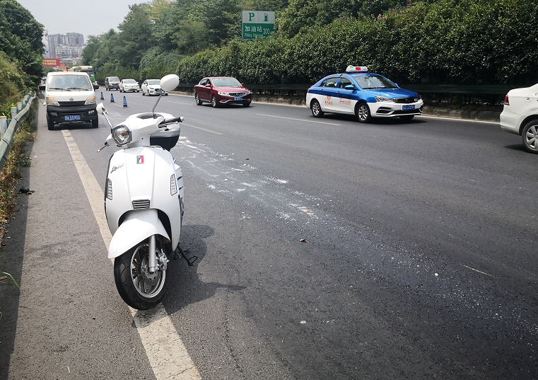 上午十一点半记者来到事发现场,此时交警已经赶了过来,并用锥形桶将两百多米的慢车道封闭起来。见到记者后,摔伤的熊先生一瘸一拐的走了过来,讲述了事发的全部经过。