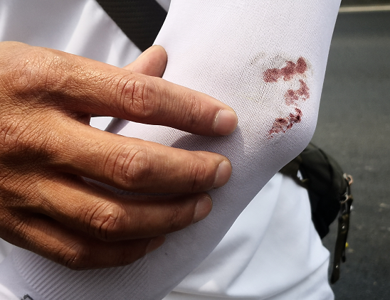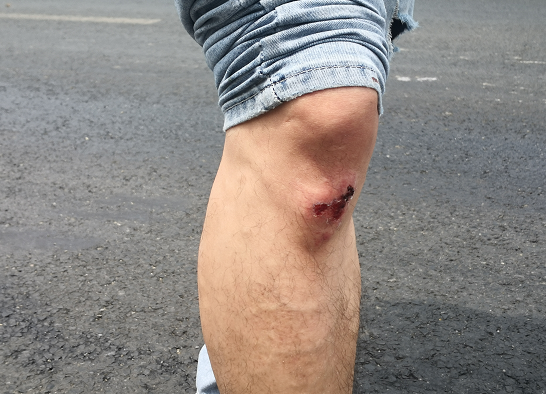 “手肘、手腕,还有膝盖这里全部搓伤了,交警来了喊我先去医院,但是我要是先去医院找不到责任方。”