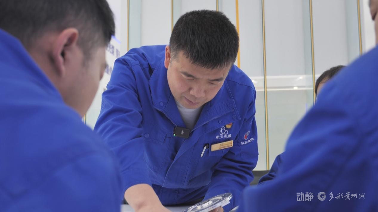 在位于贵阳市观山湖区的航天林泉科技园的“国家级张勇技能大师工作室”内,张勇手持零件,俯身向徒弟们讲解一批新产品的工艺优化细节。