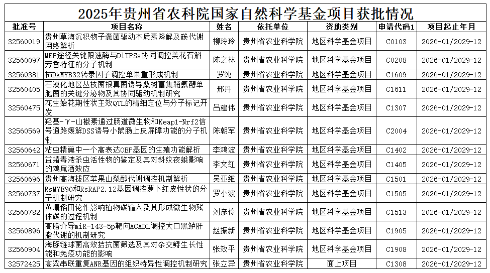 8月27日,国家自然科学基金委员会公布了2025年度国家自然科学基金申请项目评审结果。贵州省农科院成功获立14项国家自然科学基金项目,其中地区科学基金项目13项、面上项目1项。