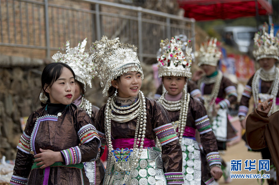 1月1日,在贵州省从江县下江镇秋里苗寨,苗族姑娘在参加芦笙节活动。新华网发(吴德军摄)