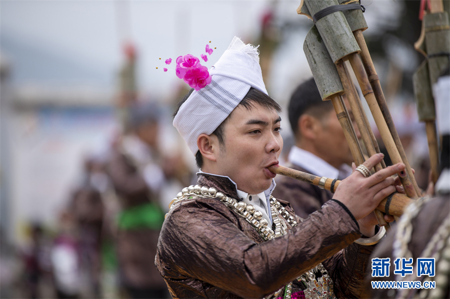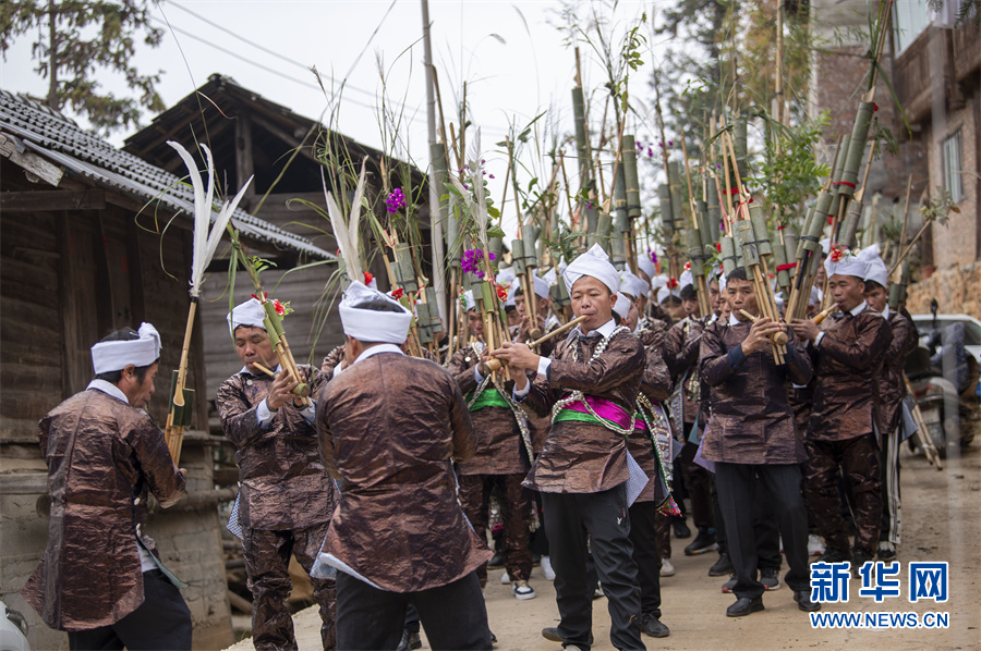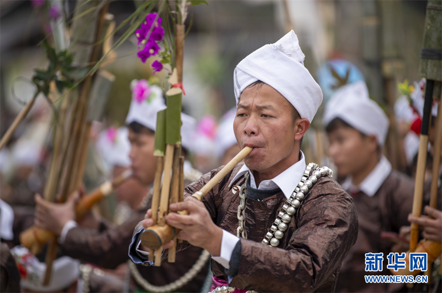 1月1日,在贵州省从江县下江镇秋里苗寨,苗族同胞吹奏芦笙。新华网发(吴德军摄)
