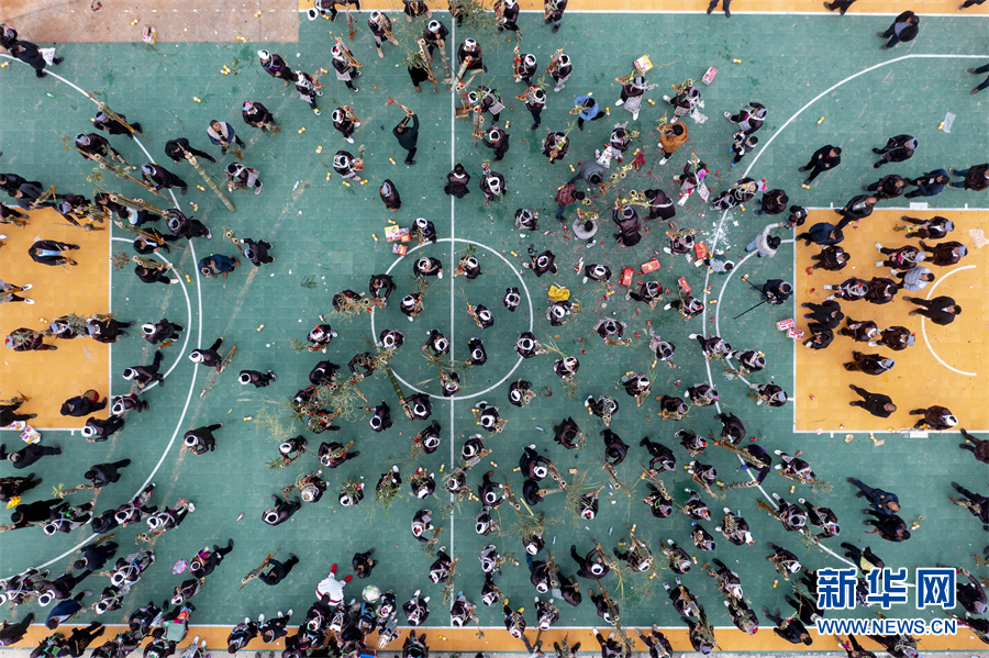 1月1日,在贵州省从江县下江镇秋里苗寨,苗族同胞吹奏芦笙(无人机照片)。