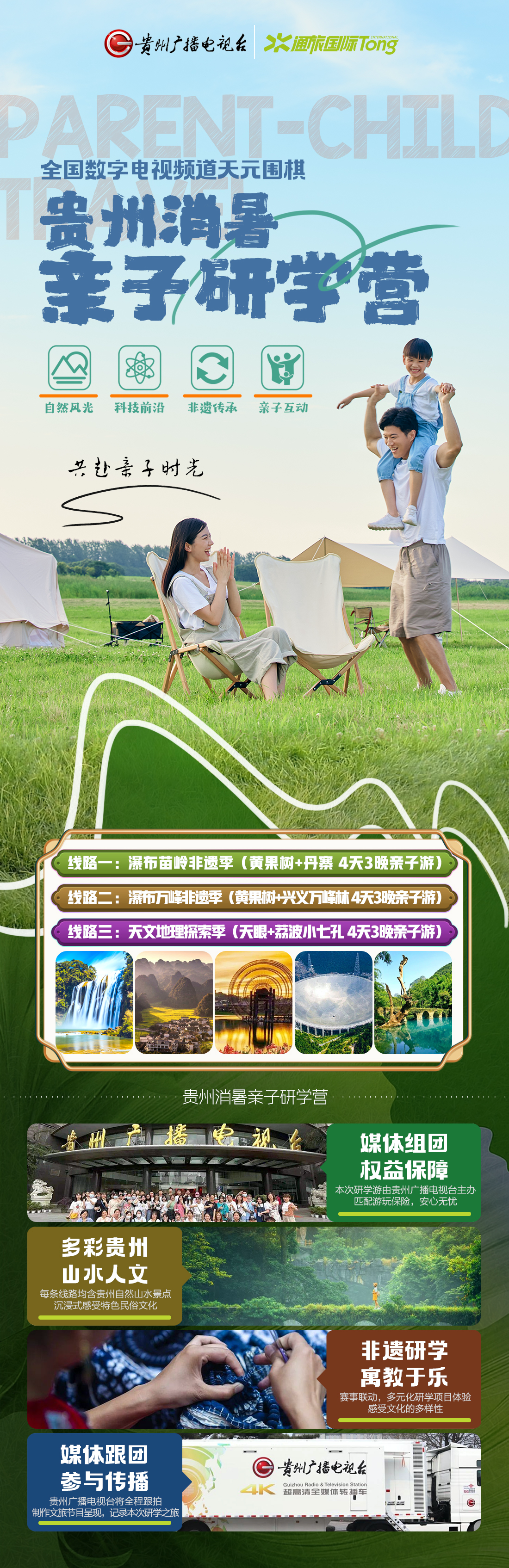 “全国数字电视频道天元围棋——2023首届贵州消暑亲子研学营”,由贵州广播电视台、全国数字电视频道【天元围棋】、贵州通旅国际旅行社有限公司联合组团,于2023年6月1日至7月15日,陆续推出“瀑布苗岭非遗季”“瀑布万峰非遗季”“天文地理探索季”三条线路产品的官方报名通道,全程匹配旅途保险,畅快游玩,安心无忧。