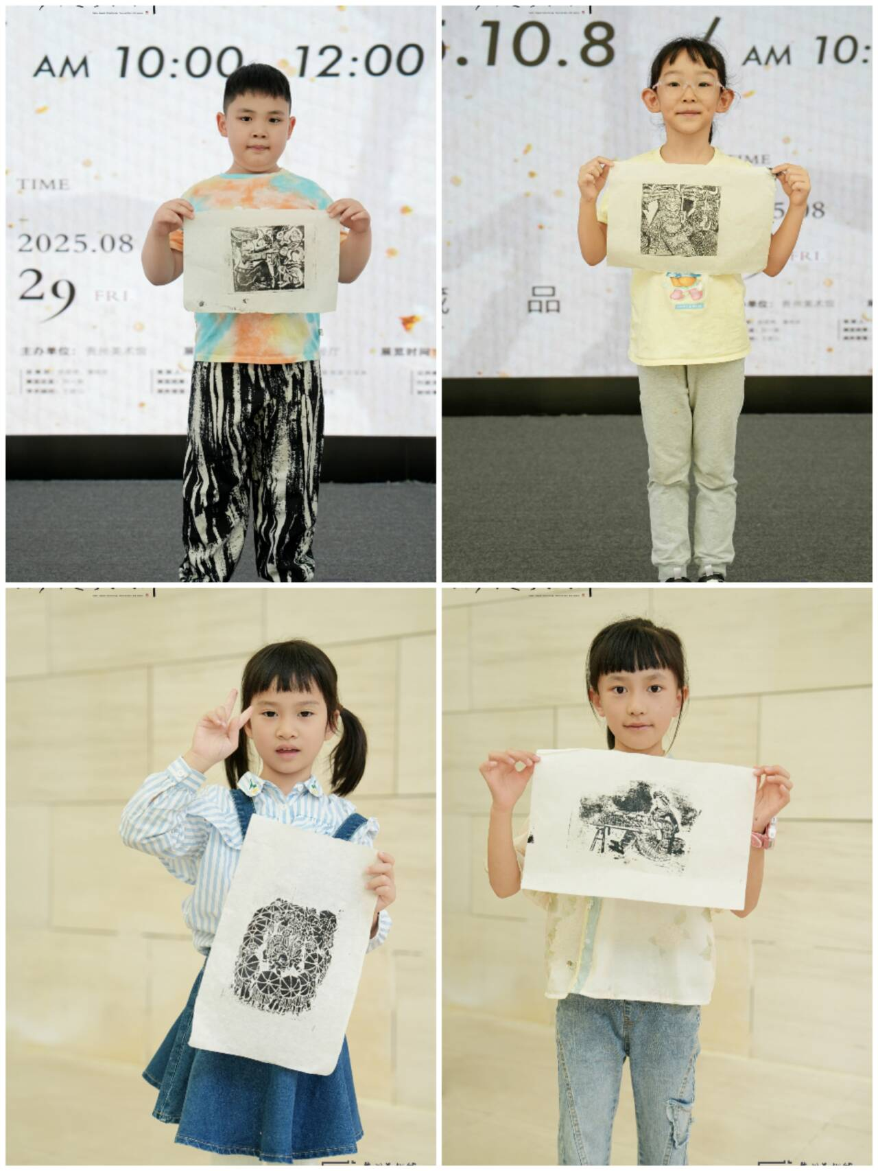 版画拓印体验环节中,选取了贾宜群《三更时分》、吴家华《奔腾不息》《侗寨秋艳》、蒋志伊《木头城》、董克俊《春返苗山》、刘隆基《乡情》、蒲国昌《喂兔〈草青青〉》《节日》及刘宗河《点蜡花》等九幅跨越半个多世纪的贵州版画经典为模板,参与者亲手滚墨、覆纸、磨印。当古法土纸被揭起的刹那,黑白分明的画面不仅再现了侗寨秋色、苗山春晓等地域意象,更让每个人在亲手实践中,读懂了贵州版画从现实主义叙事到现代形式探索的百年演进。这一刻,刀刻的力度、纸韵的温润与创造的喜悦交织,让每位参与者都成为了非遗活态传承的见证者与续写人。