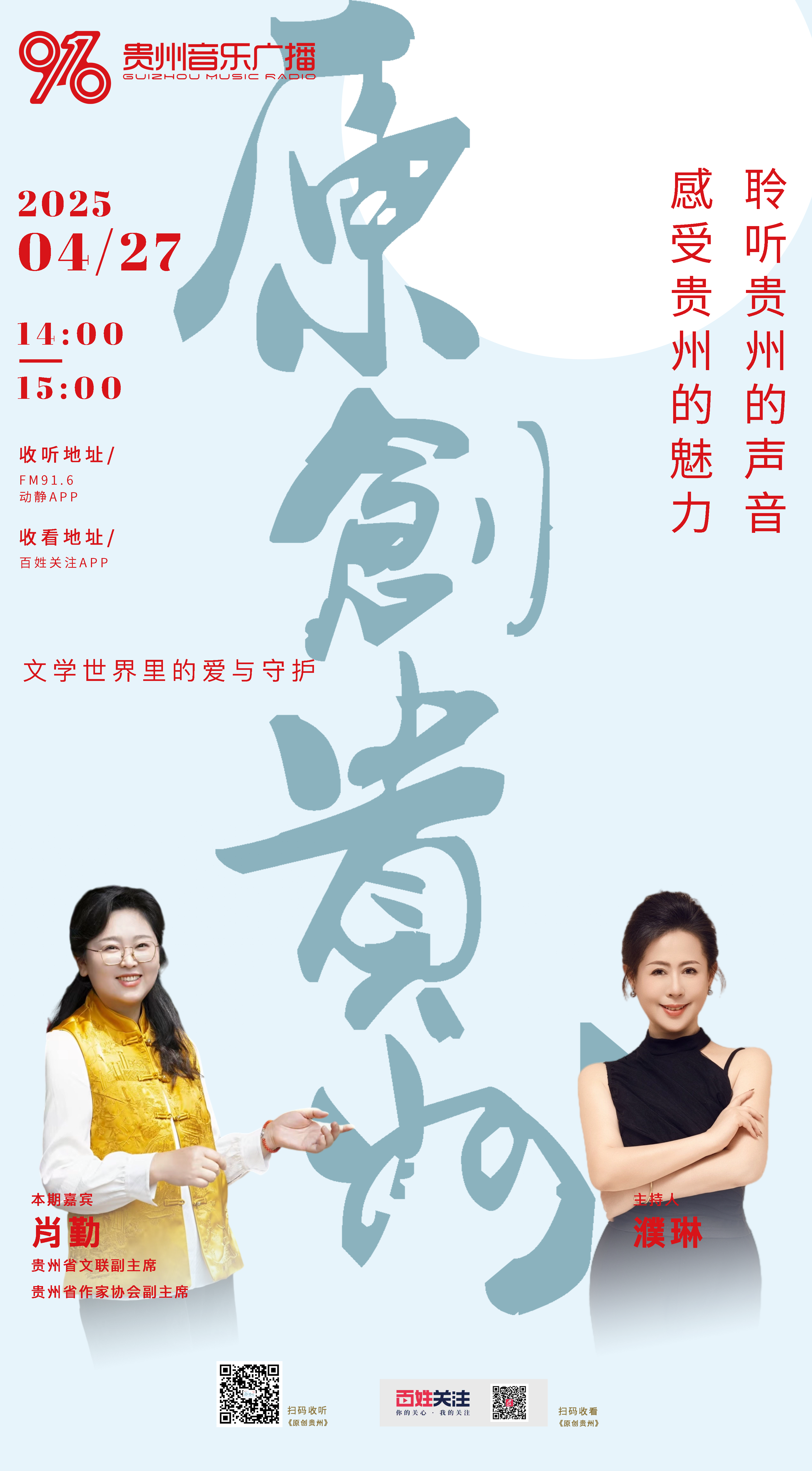 FM91.6贵州音乐广播4月27日14:00《原创贵州》对话贵州省文联副主席、贵州省作家协会副主席、作家肖勤,让我们一起走进文学世界里的爱与守护。