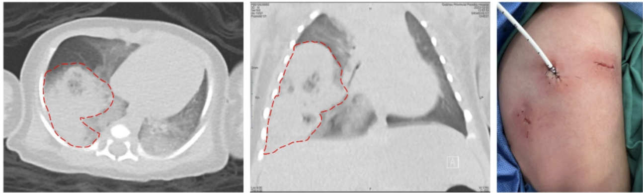 图一、图二 红色虚线指示右肺下叶病变;图三为患儿微创手术切口。