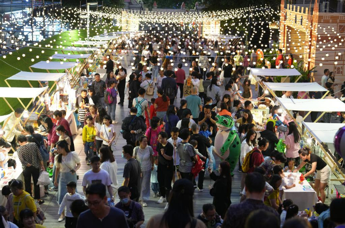 5月13日,家长带着孩子在重庆市北碚区“格林童话之夜”活动现场观赏游玩。