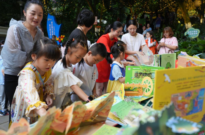 5月13日,在重庆市北碚区“格林童话之夜”活动现场,家长带着孩子选购读物。