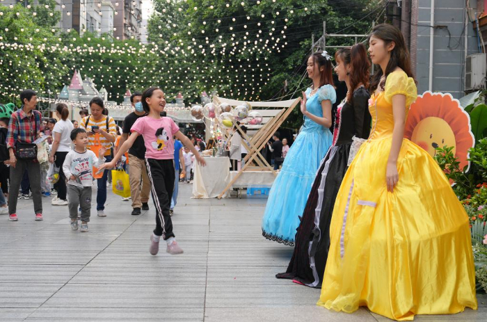 5月13日,在重庆市北碚区“格林童话之夜”活动现场,一名小女孩准备和格林童话装扮人物合影。