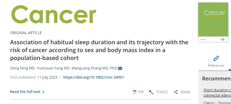 2023年7月,华中科技大学同济医学院附属同济医院的研究团队在知名期刊《癌症》上发布了一项关于国人的睡眠习惯、时间与癌症风险的研究。研究分析了近1.5万人,平均年龄58.75岁。研究发现,睡眠时间过短与癌症风险升高密切相关。