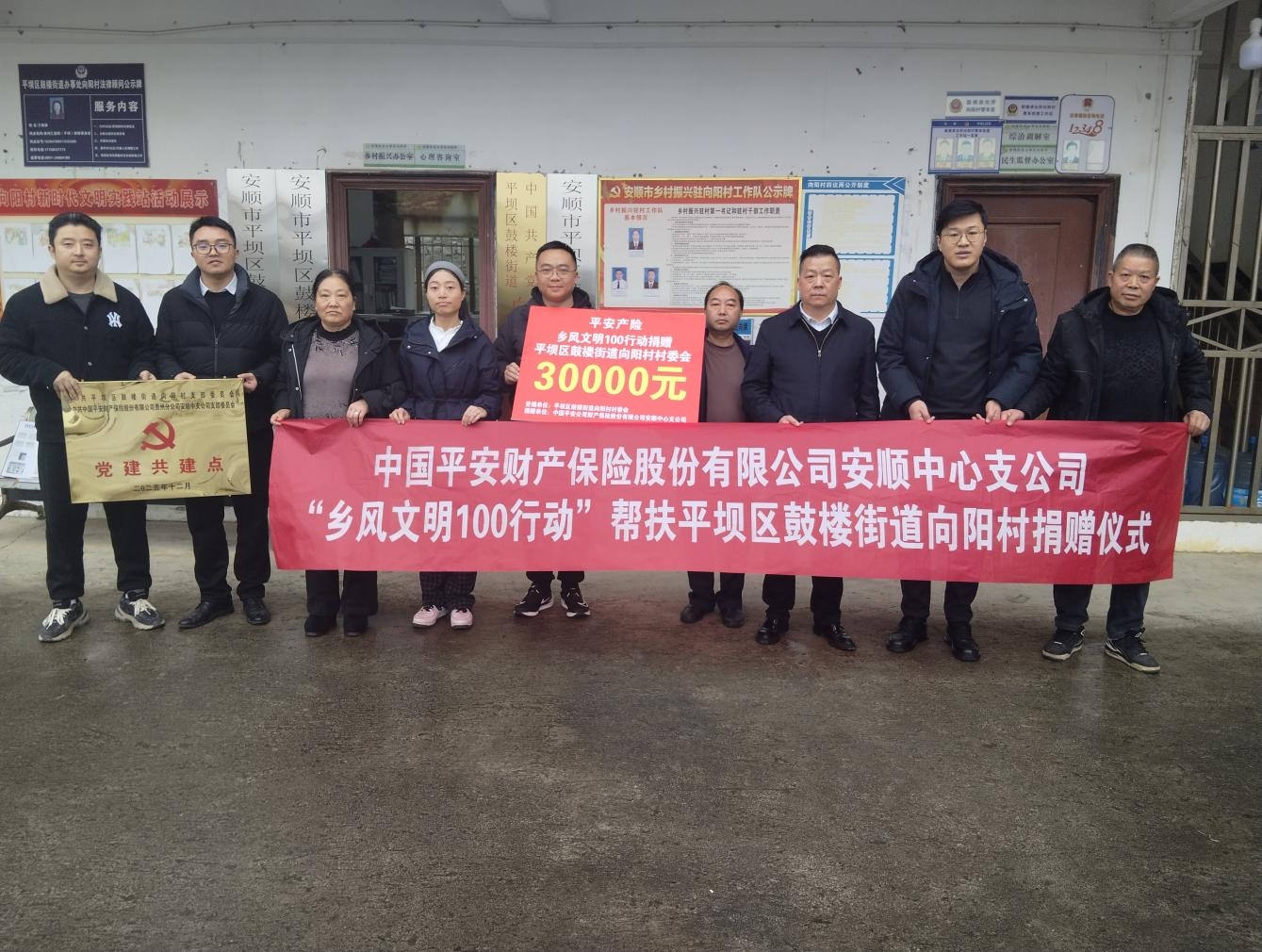 为深入贯彻乡村振兴战略部署,积极践行金融企业社会责任,2025年12月29日,平安产险安顺中心支公司在平坝区鼓楼街道向阳村开展党建共建暨“乡风文明100行动”专项捐赠活动。