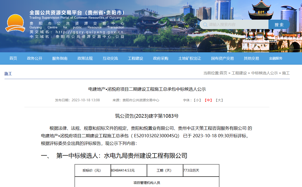 近日,贵阳市公共资源交易中心发布电建地产•洺悦府项目二期建设工程施工总承包中标候选人公示。