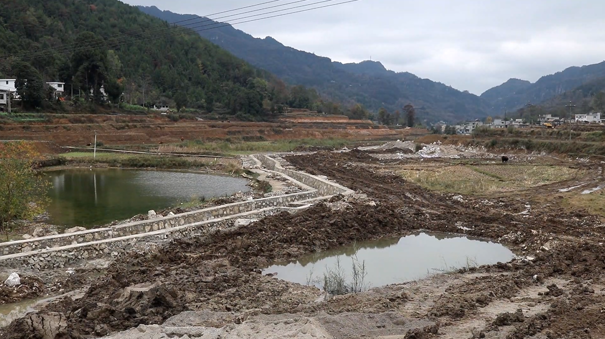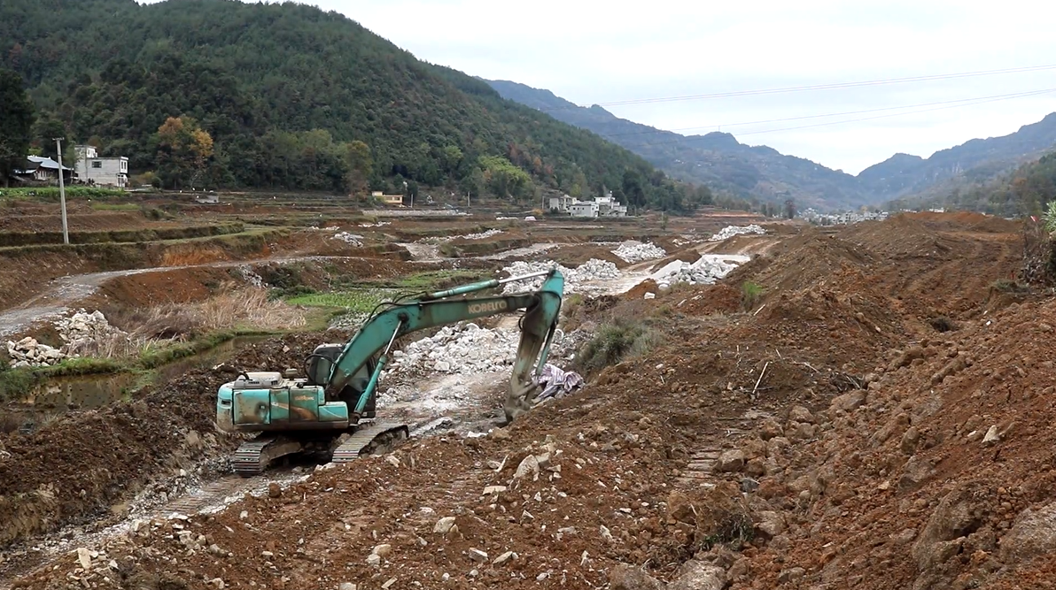 在思南县宽坪乡张湾村高标准农田建设项目现场,数十台挖掘机、推土机等大型机械不停地在田间穿梭,正在开展平整土地、开沟挖渠、修整机耕道等作业。