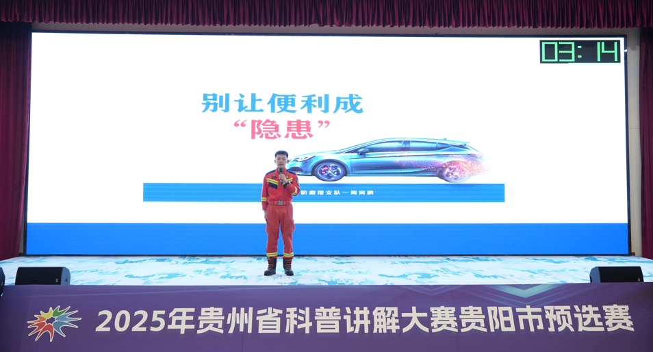 比赛现场,来自贵阳市修文县消防救援大队的周寅鹏同志以《别让便利成 “隐患”》为题展开讲解。他从新能源汽车电池的工作原理切入,深入剖析了电池热失控引发火灾的原因及特点,并结合真实的火灾案例视频,让观众直观地感受到此类火灾的严重危害。凭借条理清晰的讲解和生动形象的案例呈现,周寅鹏同志最终荣获大赛 “一等奖”。