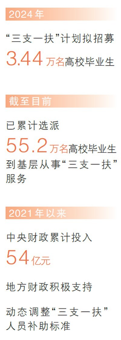 在奋斗中书写青春华章,在奉献中成就事业。2006年“三支一扶”计划开展以来,50多万名高校毕业生扎根乡村,开展支教、支农、支医等服务。2024年,“三支一扶”计划拟招募3.44万名高校毕业生到基层开展相关服务。