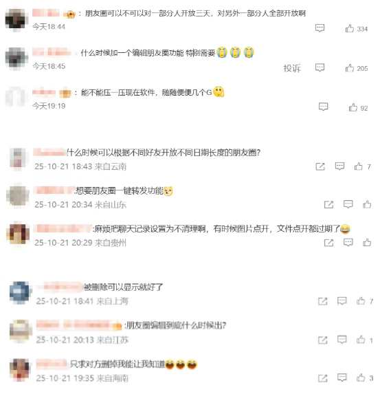 除了上述功能外,不少网友发文“许愿”微信能够优化其他功能,包括朋友圈可以分组设置可见时间、朋友圈可编辑、好友互删、朋友圈一键转发等。