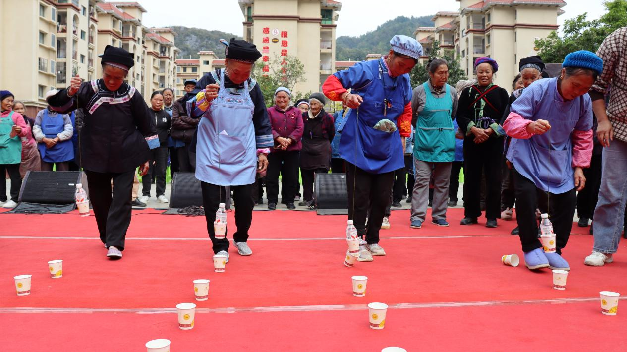 游戏环节更是欢声笑语不断,小猫钓鱼游戏中,参与者们全神贯注,仿佛化身为技艺高超的渔夫;甩进乒乓球游戏里,大家各显神通,努力将球甩进杯中;翻纸杯游戏也吸引了不少居民踊跃参与,现场气氛热烈而欢快,充满着活力与激情。