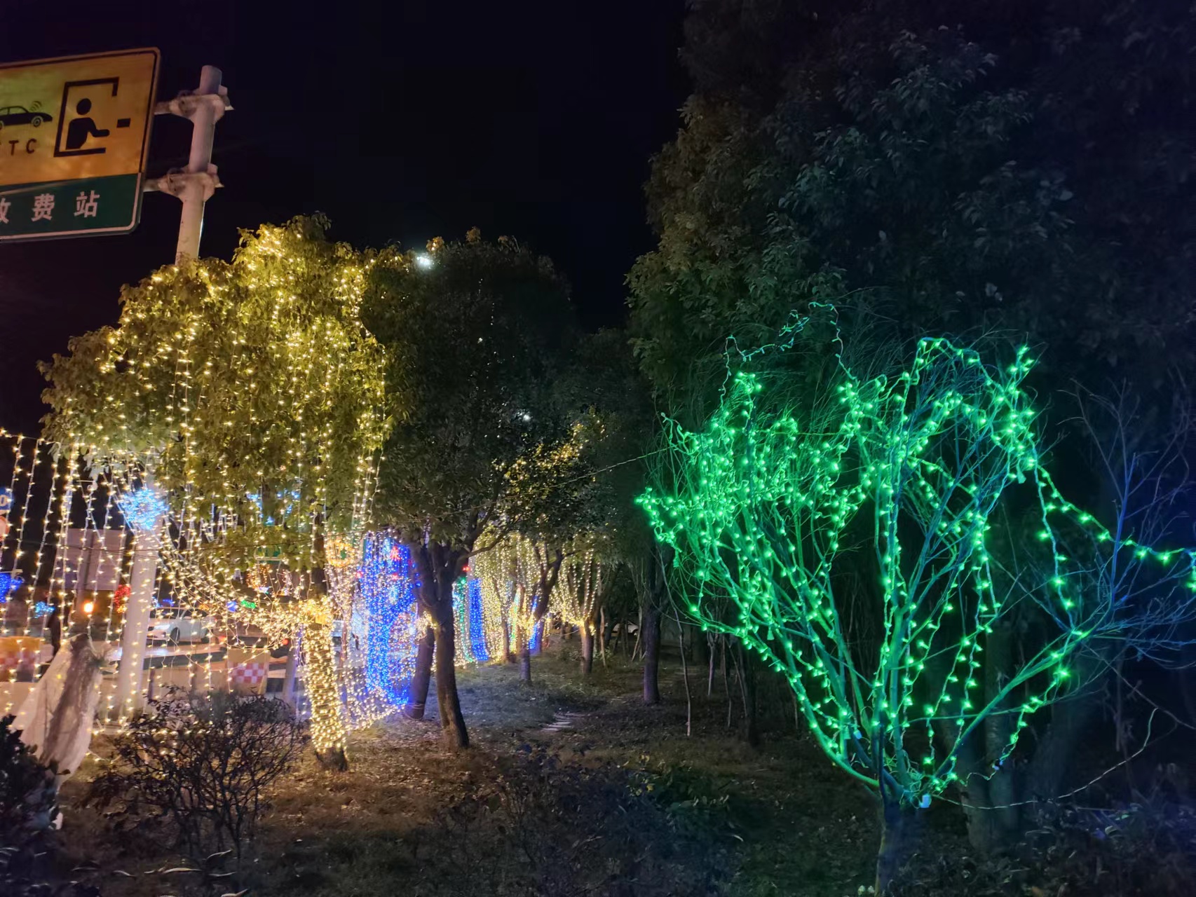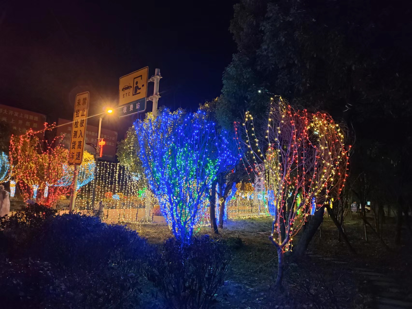 高速路口是漂泊在外的游子归乡时的必经之路,下高速后,打开车窗,寒风虽有些刺骨,但如梦如幻、形态各异的彩灯景观,总能让人眼前一亮。