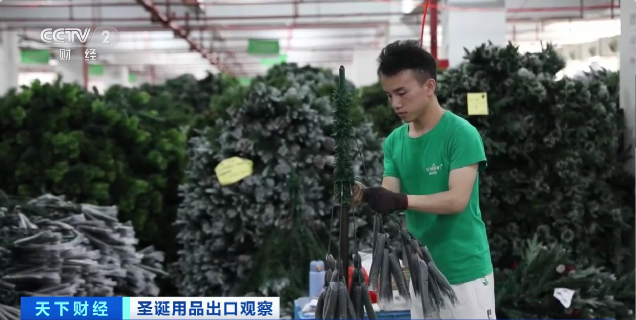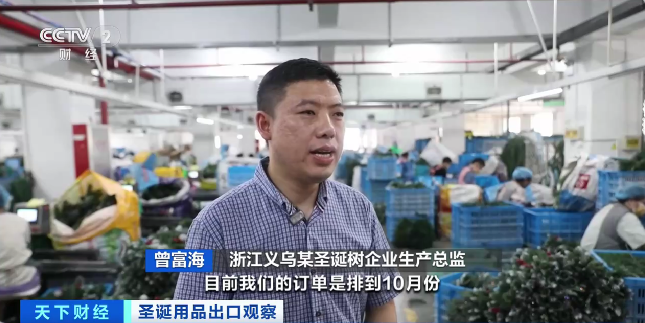 浙江义乌某圣诞树企业生产总监 曾富海:目前我们的订单排到10月份,6条生产线已经拉满,500位工人加班加点,确保客户的产品能够如期交货。