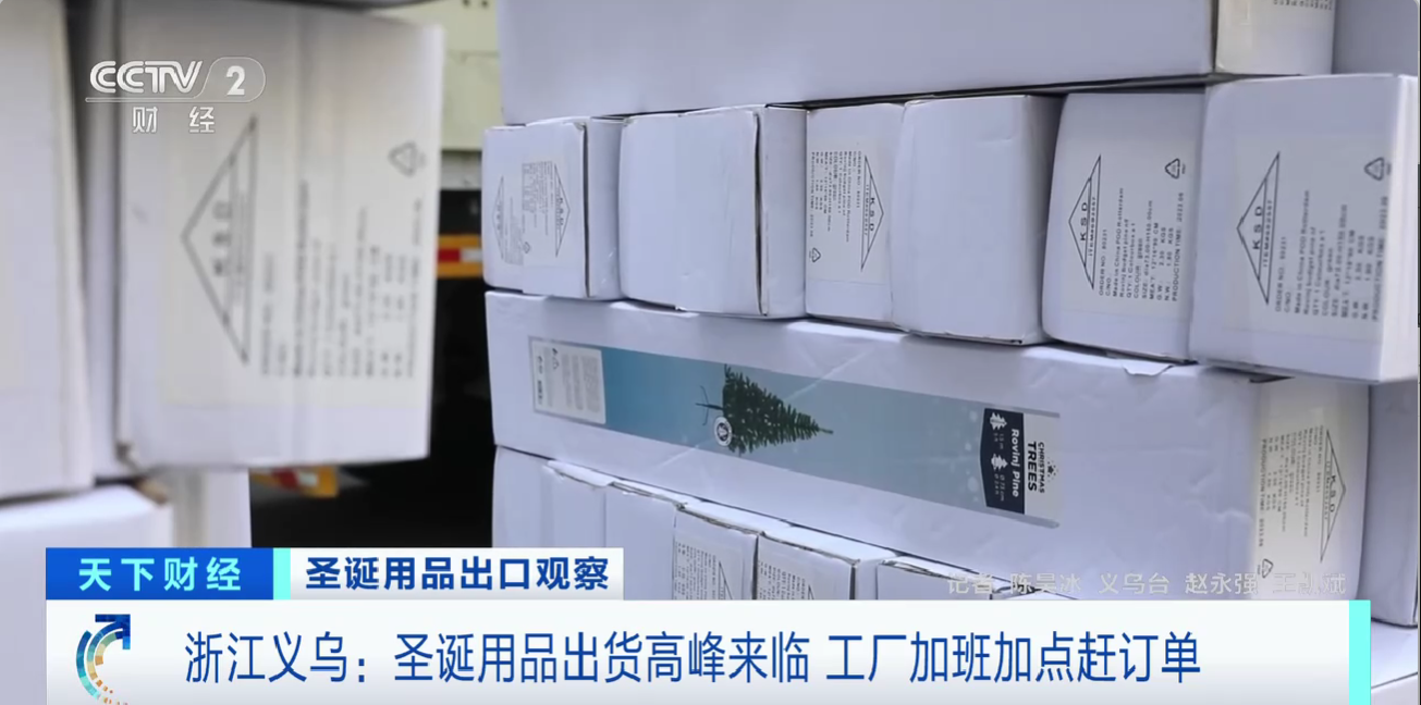 一大早,位于浙江义乌的一家圣诞树生产企业的工作人员就忙碌了起来。在仓库门口,一件件打包好的圣诞树,被装上两辆集装箱卡车。不久之后,它们就会被运到港口,乘船出海。