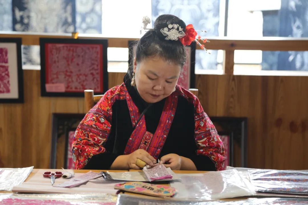 苗族女剪纸艺术家在创作时,常常一边创作一边唱,其内容多为当地民间流传的传说与民族生活写照。这是一种怎样的巧思和情怀?让一张张薄如蝉翼的剪纸,承载着厚重的民族文化记忆。