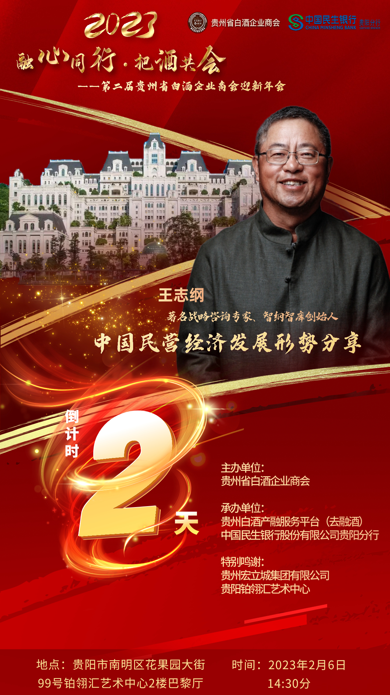 由贵州省白酒企业商会主办,贵州白酒产融服务平台(去融酒)及中国民生银行股份有限公司贵阳分行联合承办的“融心同行·把酒共会”——第二届贵州省白酒企业商会迎新年会,将于2月6日14:30在花果园大街99号铂翎汇艺术中心2楼巴黎厅举行。