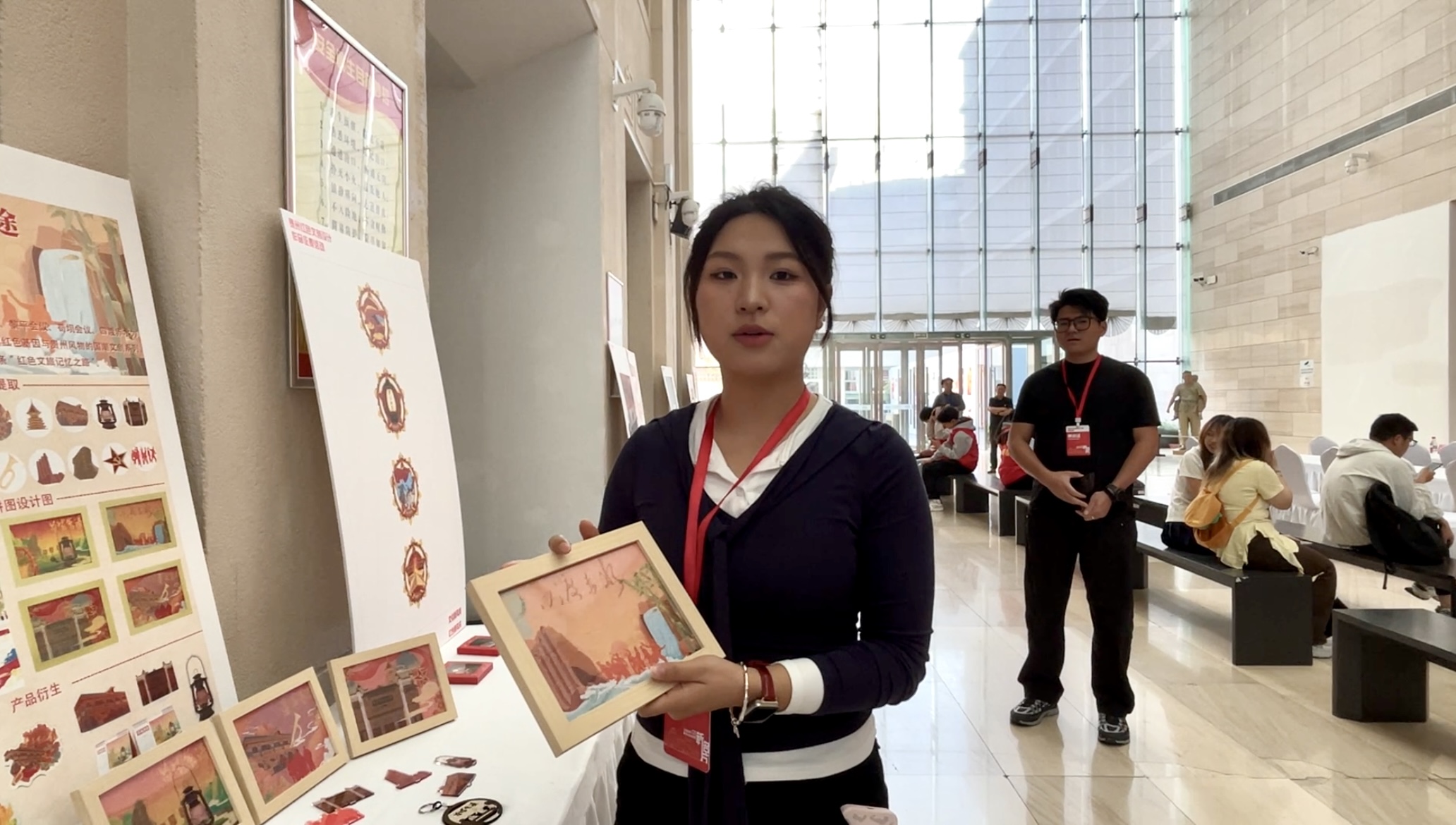 活动现场展示了多组来自高校学生的创意作品。贵州轻工职业大学学生江彩英参与设计的《红色遵义·山魂永屹》系列插画。她介绍,作品灵感源于遵义红色革命历史与黔北地域民俗文化的融合。设计中以遵义会址为核心,融入茅台渡口、赤水大瀑布、傩戏面具、和平鸽等元素,采用剪纸艺术与红白色调,既突出革命精神,也呈现黔北非遗。