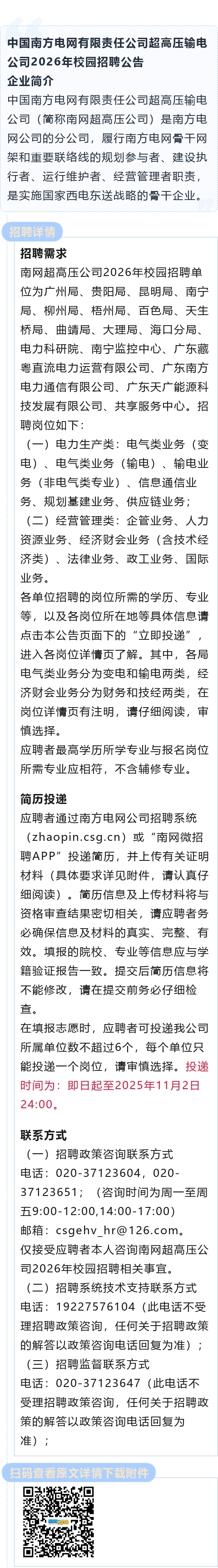 【国企】中国南方电网有限责任公司超高压输电公司招聘!贵州有岗!