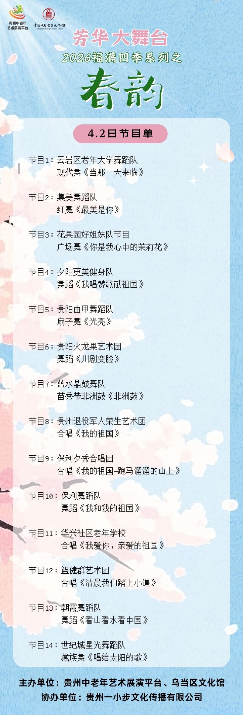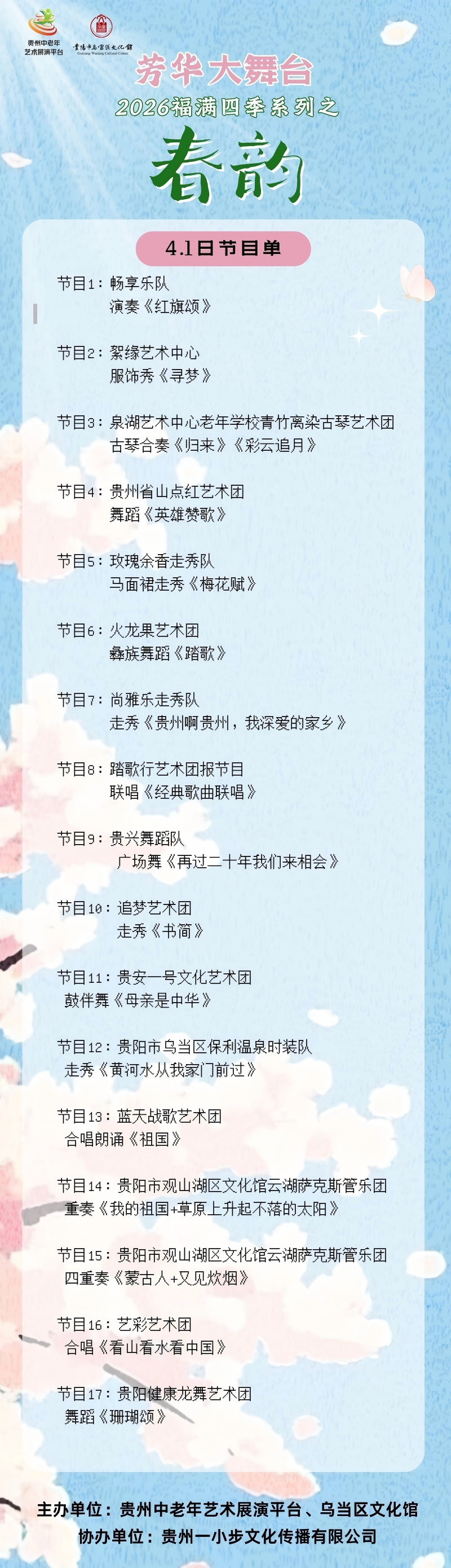 4月1日,由贵州中老年艺术展演平台主办、乌当区文化馆协办的“芳华大舞台——2026福满四季系列之‘春韵’” 在贵阳市乌当区文化馆精彩上演。来自贵阳及周边地区的二十余支中老年艺术团队齐聚一堂,用歌声、舞蹈、走秀、器乐奏响春日的华章,展现了贵州中老年人蓬勃向上的精神风貌。