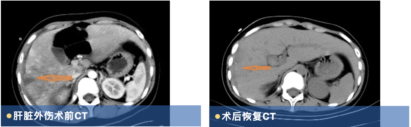 CT结果提示:肝脏挫裂伤并血肿形成。因肝脏破裂,腹腔盆腔内积血积液肝脏破裂伤分级四级,需进行手术治疗。