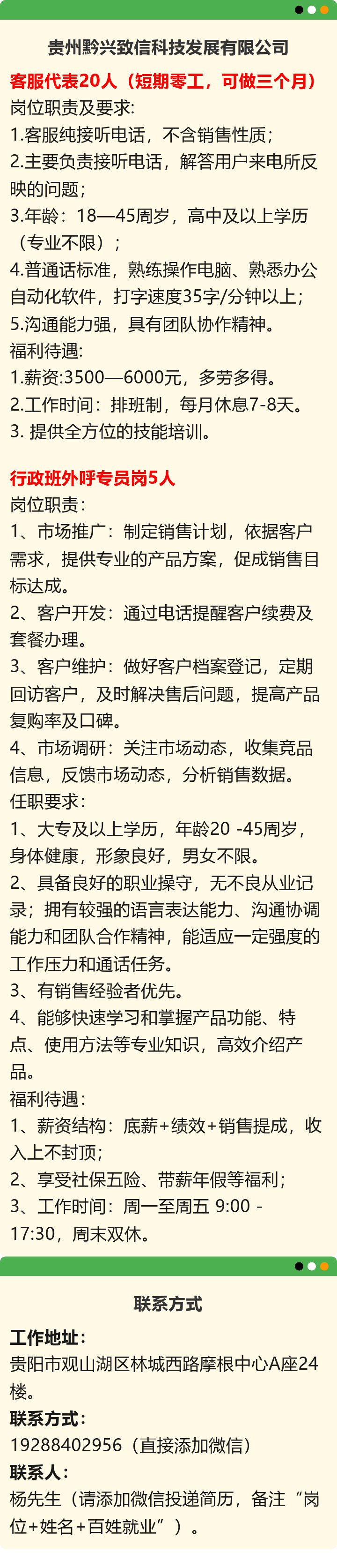 贵阳市观山湖区招聘!可短期零工!高中起报!