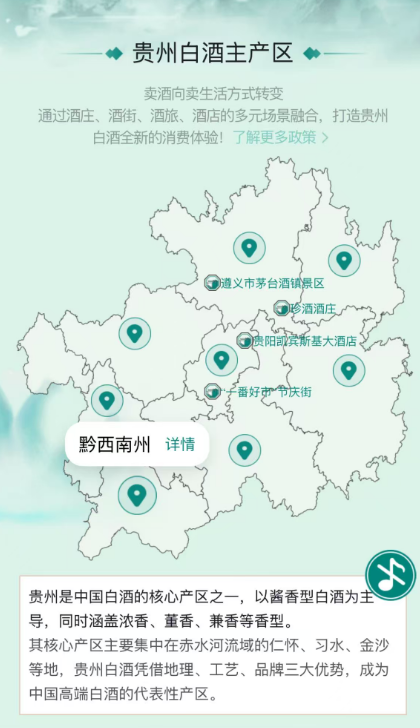 平台界面清晰明了,展示了贵州各大白酒产区的地图,用户点击后便可查看相应产区的具体位置和相关产品,使用户能够直观感受不同产区的白酒文化。