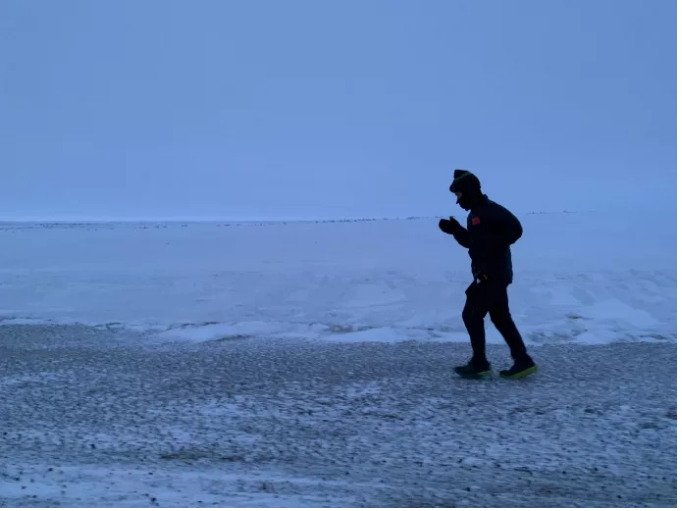 除了幽暗的微光和醇厚的白雪,只有白斌孤独奔跑的身影。加拿大时间2019年5月8日7点19分,白斌抵达终点。