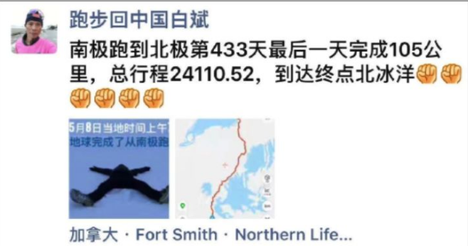 一个中国人耗时433天,从南极跑到北极,行程2.4万多公里,相当于在433天里挑战了571个马拉松;从而完成了无论是对于个人而言,还是对人类而言的一个壮举,他就是著名中国极限跑者白斌。