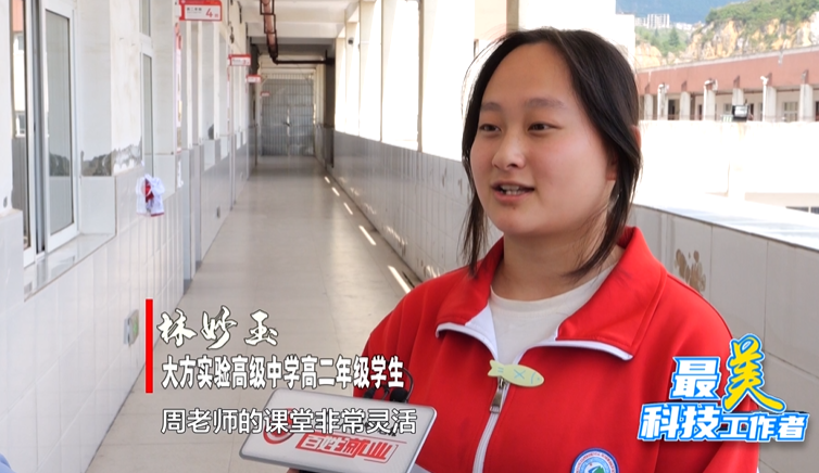 大方实验高级中学教师、科技辅导员周志凌:我小的时候就开始接触科技创新了,读大学时,我获得了一个大学生科技创新成果的二等奖,得了800元钱的奖金。从那以后,我更加喜欢科技创新。再后来,我就把科技创新带到了我的工作中。