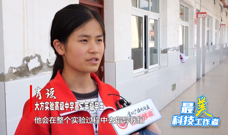 大方实验高级中学教师、科技辅导员周志凌:回到大方县坝子中学之后,我看到那里的环境非常差,没有实验室也没有教具,我就开始寻找好的教育方法,教学生创新。这些效果和方法对教学非常有效,激励了我。