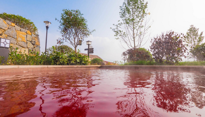 大河堡温泉内设多种泡池,红酒、牛奶、酒仙池等50余个,水温高达55℃,富含硒、锶、锌、锂、碘等多种微量元素。